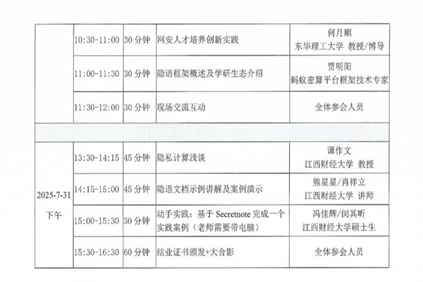 培训日程丰富,上午涵盖数据要素行业政策和技术发展、网安人才培养创新实践、隐语框架概述及学研生态介绍等内容,并设有现场交流互动环节;下午则包括隐私计算浅谈、隐语文档示例讲解及案例演示、动手实践以及结业证书颁发与大合影等环节。
