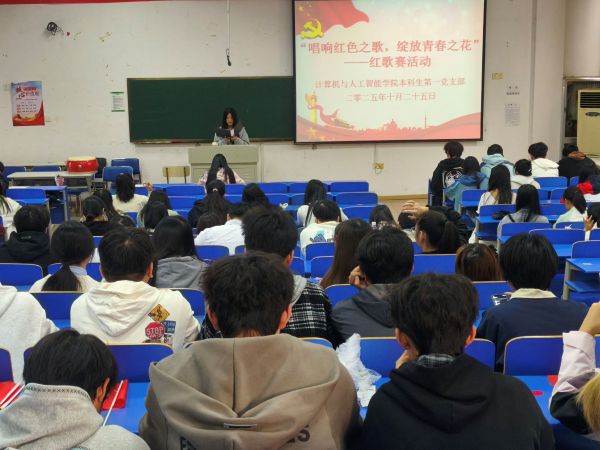 为传承红色基因,弘扬革命精神,引领青年学子在红色旋律中汲取奋进力量,2025年10月25日,计算机与欧美性爱 本科生第一党支部在欧美性爱 生活动中心D101举办“唱响红色之歌,绽放青春之花”红歌赛活动。活动通过红歌演唱与党史知识互动结合的形式,为师生呈现了一场沉浸式的红色文化盛宴,支部党员、入党积极分子及学生代表共100余人参与。