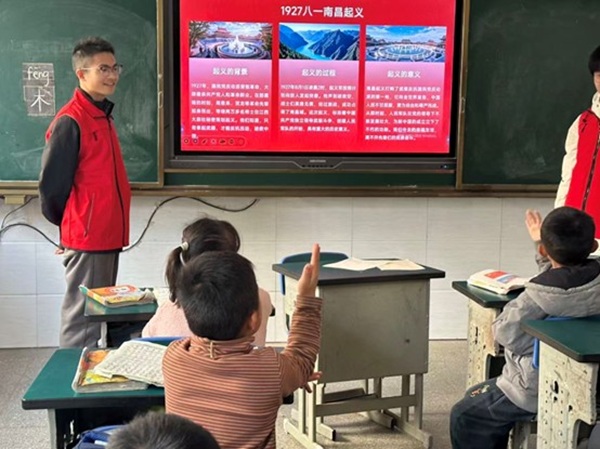 活动中,支教队员们以生动形象的语言,向孩子们讲述了“八一南昌起义”的英雄故事、“方志敏两条半枪闹革命”的坚定信念,以及“胡闵恩姐妹志愿讲解”的传承事迹。孩子们听得津津有味,积极举手互动,分享自己对英雄人物的理解与敬佩。