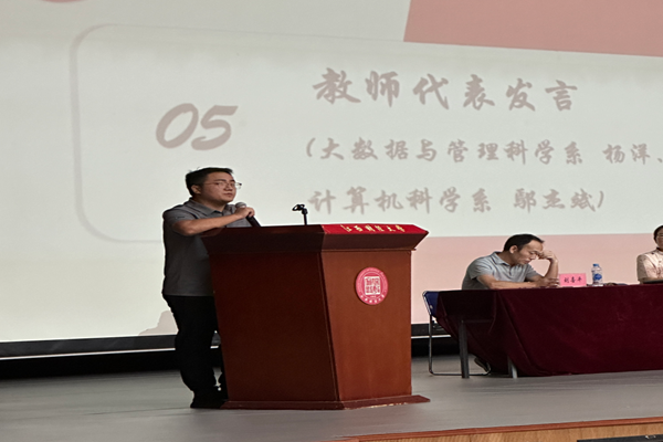 教师代表发言,大数据与管理科学系杨洋老师对新生寄语期盼:“欧美性爱 不仅是学习知识的殿堂,更是培养实践能力的平台,同学们要积极参与社会实践,科研项目和创新活动,把课堂上学到的理论知识,运用到实际中去。”计算机科学系鄢杰斌对如何调整学习状态做出几点建议。