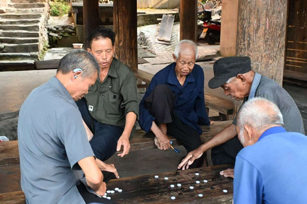 侗寨鼓楼下老者对弈侗棋的日常生活场景