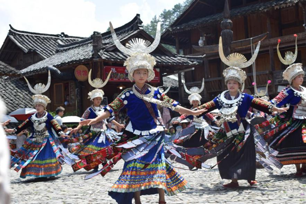图为郎德苗族姑娘踏笙而舞,展现传承千年的《锦鸡舞》